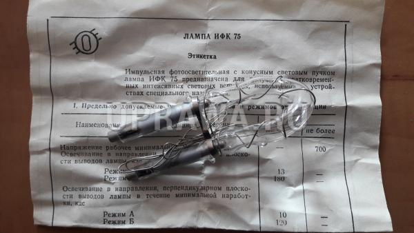 ИФК-75 импульсная лампа фотоосветительная с конусным световым пучком, выпускается по ТУ 3.374.152 и служит для получения интенсивных световых вспышек. Используется в производстве светоимпульсных отмашек на судах внутреннего и смешанного река-море судоходства для управления и подачи световых сигналов а также в качестве источника света в различных светосигнальных устройствах.