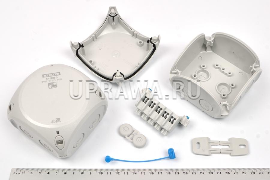 KF0202G IP66/67/69 Hensel коробка соединительная предназначена для наружной установки (установка в агрессивной среде и/или вне помещений). 5-ти полюсная, подключений на полюс: 8x0,75 мм². Габаритные размеры: 93х93х62мм. 7 преднамеченных выбиваемых отверстий для кабельных водов M20. Стойкость к воздействию прямых струй воды под давлением: максимальное давление воды 100 бар, температура воды макс. 80 ° C, расстояние ≥ 0,15 м, в соответствии с DIN EN 60529: 2014-09 (IEC 60529: 2013) имеет класс защиты IP 69.
